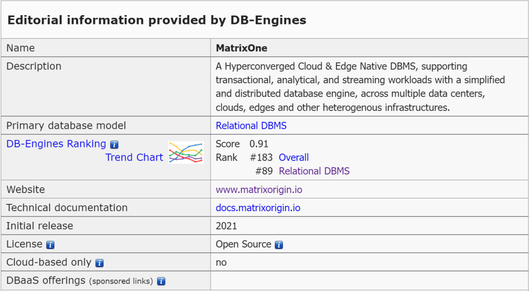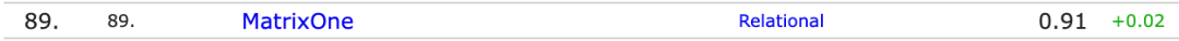 ▶ 号外!新一代超融合异构数据库Matrix One首度上榜DB-Engines Ranking of Relational DBMS,目前排名第89位。