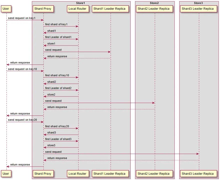 用户分别向key1,key10和key20数据发送请求,下图说明了请求如何通过Shard Proxy路由组件并被转发。