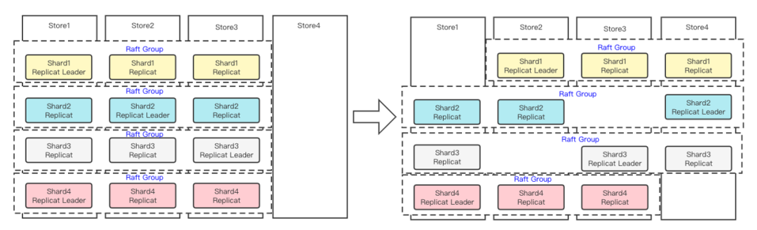 在下图的例子中我们看到,初始状态的三节点在增加第四节点的情况下,每个节点的4个Shard被均摊到了4个节点上,而本来不均衡的Leader数量也均摊到了每个节点上