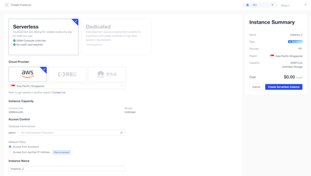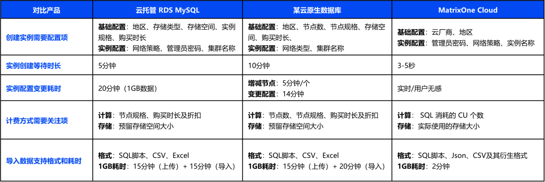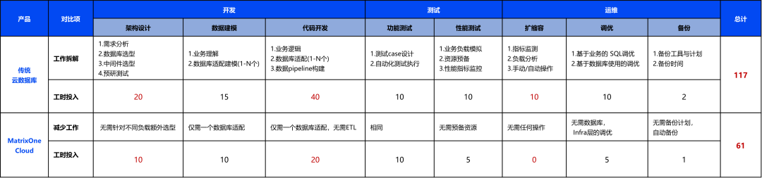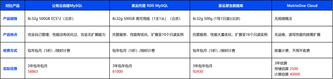 体验更加流畅 以 TPC-H 应用场景为例,我们现场对比了某公有云的云托管数据库、云原生数据库和 MO Cloud Serverless 实例的操作体验,发现 MO Cloud 在实例的创建和资源变配等方面更加简单和迅速,计费方式更简单。 << 左右滑动查看全图 >> 成本更具优势 机器成本优势 MO Cloud Serverless 实例具有自动扩缩容、按实际用量收费的优势,因此在价格上更具优势。以 500GB 数据存储、8 核 32GB 内存计算资源需求的应用场景为例,我们演算了不同类型的公有云数据库的机器成本(如图示),MO Cloud Serverless 实例费用要比其他种类的公有云数据库便宜 30%-50% 之间。 同时,作为一款 HTAP 数据库,如果用户的数据业务兼有在线事务处理和分析需求,MO Cloud Serverless 实例可以直接满足。而其他几款公有云数据库则需要另外购买数据库资源以及 ETL 处理资源。 << 左右滑动查看全图 >> 人力成本优势 MO Cloud Serverless 实例在人力投入成本上也更加便宜。以需要一定报表能力的小型管理系统为例,我们演算了传统云数据库和 MO Cloud 的综合人力投入对比。 在开发阶段,支持了 HTAP 能力的 MO Cloud 不需要多数据库选型和 ETL 适配; 在运维阶段,MO Cloud 的自动弹性伸缩能力消除了用户的监控和扩缩容操作,既能实时享受极致的性能,又不需要用户自己干预资源变更。 如图示,MO Cloud Serverless 实例整体人力成本降低一倍,业务敏捷度也得到了很大提升。 << 左右滑动查看全图 >>