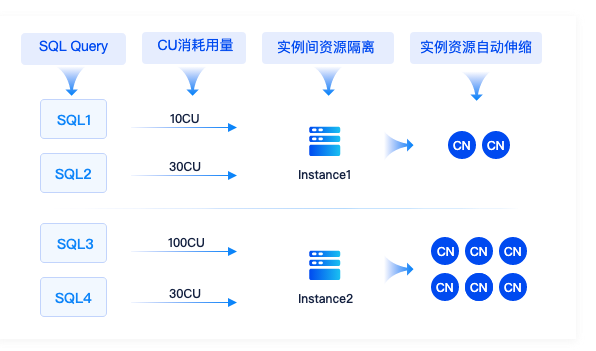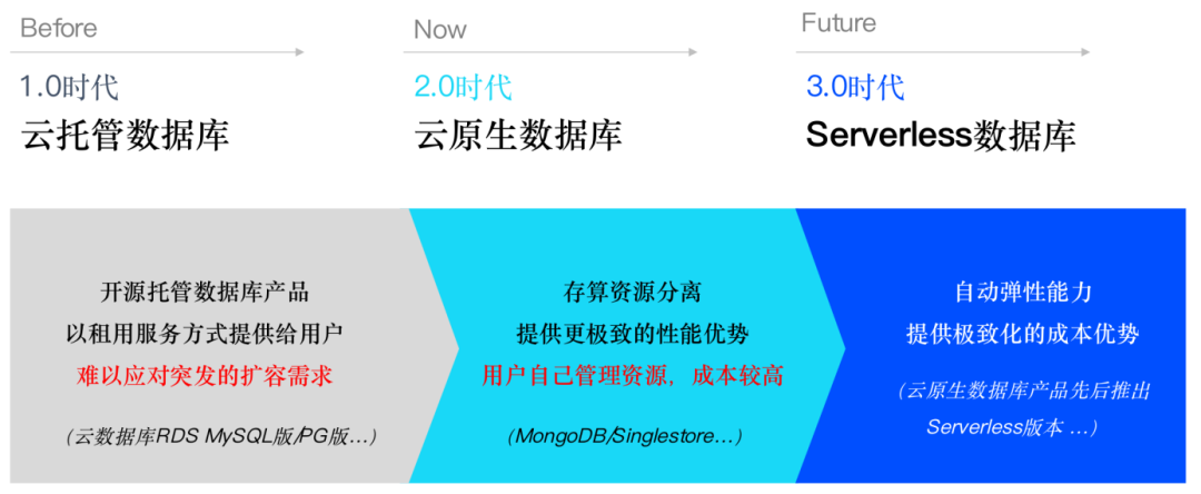 公有云数据库 3.0:Serverless 数据库 近年来全球云数据库迅猛增长,收入占 DBMS 总收入的一半以上。相比本地数据库,公有云数据库在资源伸缩、机器成本、可用性、运维和开发效率等方面更具优势。 公有云数据库发展至今经历了云托管、云原生和 Serverless 三个时代。 云托管数据库以租用服务的方式向用户提供数据库服务,简化了部署和运维数据库的难度,但难以应对突发的扩容需求; 云原生数据库采用了存算分离的架构,实现了不错的线性扩展能力,但需要人工监测资源利用率并触发扩缩容,成本较高,实际操作中也很难做到实时响应; Serverless 数据库将部署、扩缩容资源等运维操作做到了自动化,提供了兼具极致性能和成本的解决方案,用户不需要再为资源考虑,而仅需为实际执行的业务付费即可。 MatrixOne Cloud 的 Serverless 特性 MatrixOne Cloud (MO Cloud) 支持创建 Serverless 数据库实例,并可以做到完全对用户屏蔽机器资源。实际操作中,用户仅需为实际执行的 SQL 以及数据存储的大小付费。 MO Cloud 的内核引擎是一个具有 HTAP 能力的云原生分布式框架引擎。存算分离的架构和无状态的计算节点令计算资源具有灵活且迅速的扩缩容能力,为按实付费提供基础能力;同时冷热存储的设计使得底层存储可以使用价格低廉的对象存储,进一步节省用户的数据存储费用。 Serverless 的设计模式使得 MO Cloud 实例功能具有简单、易用、高效等特点: 零门槛部署 用户创建实例时,不需要关注资源,简单配置后即可秒级完成部署。 全托管服务 : 实例支持各种一键运维操作,同时具有较为完善的业务监控,以及可视化的数据对象管理能力,用户可以在网页端高效地运维实例。 Serverless 化 SQL 体验 以 CU(Compute Unit)为计量单位,按 SQL 实际消耗的 CU 数计费,用户仅需关注 SQL 本身;实例可以感知业务变化快速扩缩容资源,在高并发场景下也可以享受到极致性能,并且实例间资源相互隔离,SQL 性能互不影响。 极速在线分析能力 友好的在线 SQL 编辑器和互动 Tutorial,同时提供详尽的 SQL 分析能力,让用户快速上手数据库开发。 多云部署支持 MO Cloud 的实例支持跨公有云 DaaS 服务,满足多应用的不同地域访问需要,异构云原生技术架构,支持公有云和 On-Premise 混合部署,提供统一的部署和管控方案。