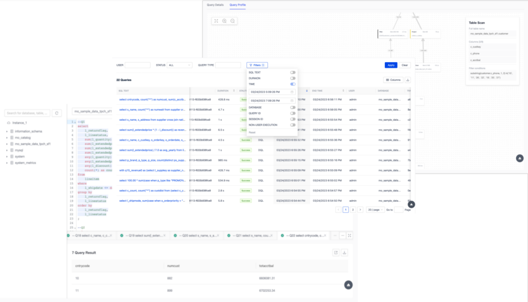 对比私有化部署,MO Cloud 具有成本优势吗?随着业务和数据规模的不断增长,成本优势是否依然存在? 从机器成本上看,私有化部署需要一次性购买机器资源,而 MO Cloud Serverless 实例具有自动扩缩容、按实际用量收费的优势,因此在价格上更具优势。 从人工成本上看,私有化部署需要选型数据库、规划机器资源,还要部署一套运维和监控体系。当业务规模增加时,需要规划采购新机器并手动扩容集群,而 MO Cloud 实例在这些方面基本不用人工干预。 我们是做 AI 业务的,MO Cloud 与当前正火的 AI 技术有什么好的应用关联吗? 目前数据库与 AI 行业有着紧密的功能联动,比如向量数据库可以支持 AI 向量的存储和计算;再比如利用 NL2SQL 模型,提供一种用户输入自然语言,结合用户数据特征,生成可执行的 SQL 语句或报表的功能。MO Cloud 作为一款超融合数据库,也在积极规划这些功能,相信在不久的将来就会上线。 有没有一种比较便宜的计算资源提供给我们,可以用于一些特殊的业务上,这些业务可以接受性能差。 首先,MO Cloud 是按 SQL 计费的,所以无论是使用少量的计算资源执行更多的时间,亦或是使用大量的计算资源执行更少的时间,SQL 所消耗的 CU 数是差不多的,所以 MO Cloud 是一种极致的 SQL 成本解决方案。 其次,MO Cloud 的 CU 单价与公有云所以提供的机器价格密切相关。在公有云上有一种超卖的计算资源,AWS 称作 Spot 实例,国内的阿里云称作抢占式实例,这些实例的价格要远低于相同机型按量付费的实例价格,但服务性能和稳定性相对较差,我们正在调研将这样的公有云机器应用到 MO Cloud 无状态的计算节点上,如果可行,将进一步降低 CU 价格。 既然 Serverless 实例按 SQL 付费,能否提供查看和分析高消费 SQL 的能力? 您说的这个功能当前是有的一部分的,在查询历史功能中可以查看到每条 SQL 所消耗的 CU 量,您可以通过筛选和排序来找到这些 SQL,同时针对这些高开销 SQL,可以进入 SQL 详情通过可视化的执行计划进一步分析和优化 SQL。 后续我们还会专门提供 Top SQL 功能,可以将这些大 SQL 以更加方便的形式展示。 如果您在业务场景和生产中也面临各式各样的数据库问题,欢迎加入MatrixOne Beta Program,与来自工业、建筑、科技、互联网等数十个行业的专家进行探讨。