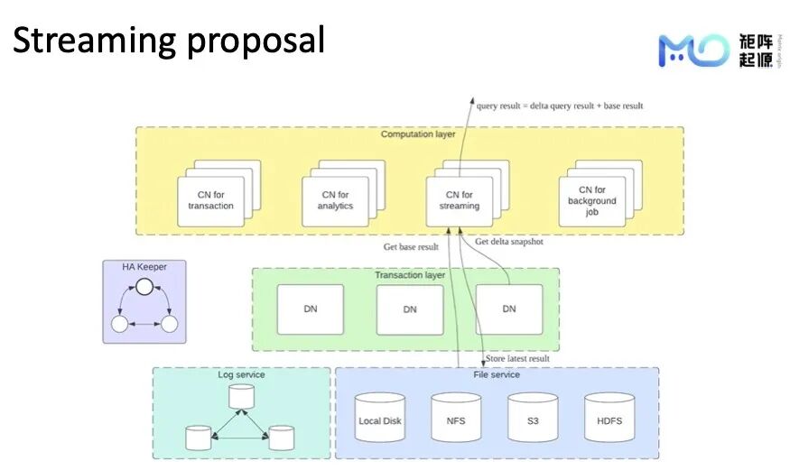 目前由两种方案做streaming,一种是数据发生修改,根据上一次产生的snapshot和当前的snapshot产生的delta snapshot推到CN节点上,CN节点本身根据streaming任务生成DAG图,在DAG图上做增量计算。增量计算也会取得上一次查询结果,以此为依据做增量计算。