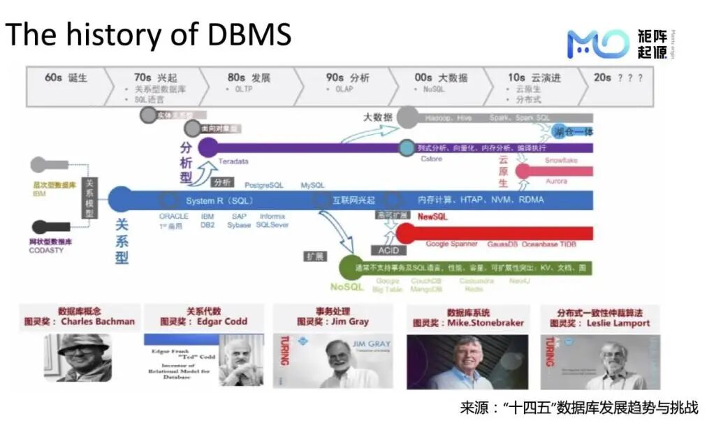 2000年开始逐渐出现了以Hadoop为代表的大数据系统,其中包括Hive、Spark等。同一时期,为解决传统数据库横向扩展能力受限问题出现了多种解决方案,一种方案是在传统MySQL数据库等基础之上做分库分表中间件,在中间件的基础上实现分布式事务能力;另一种方案则是以Google Spanner为代表的NewSQL,此外还包括OceanBase、TiDB、CockroachDB、YugaByte等,其特点是底层基于KV引擎,上层利用Raft、Paxos共识协议保证日志和状态机的可靠。