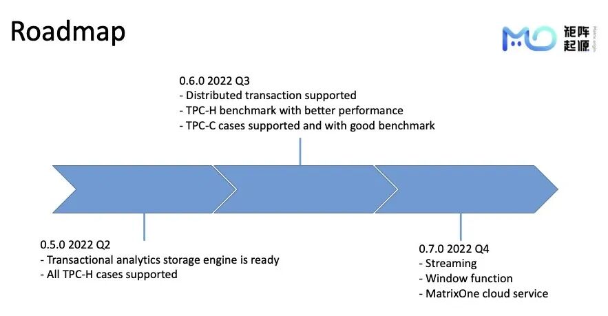 2022年底计划发布的0.7版本将支持streaming,也会支持更多高级SQL、window function等。0.7版本MatrixOne计划上线云服务。