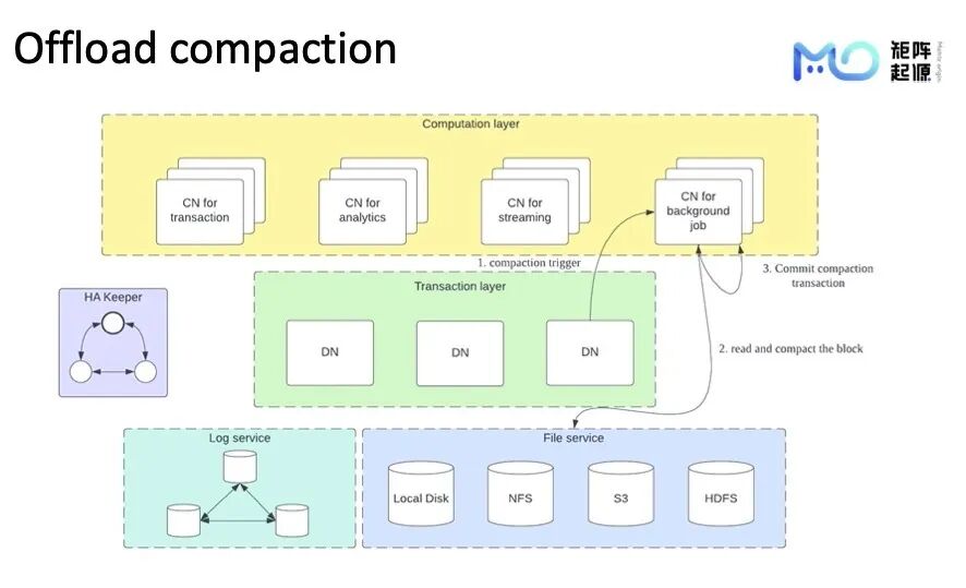 当DN节点发现数据删除过多,数据零散,这时会进行数据合并。数据合并时触发一个专用的用来做compaction节点跑合并,CN节点会把要发生compaction的数据进行收集,在CN节点内合并后提交。