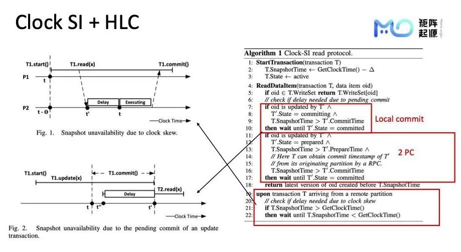 对于第二个错误,Clock SI使用上图中的算法1解决这两个问题。当T.SnapshotTime超过了当前提交时间戳才能读到数据,否则进行等待;也就是当前如果有事务在做prepare和commit,需要等待prepare和commit都完成后才可以进行冲突检测、做提交。