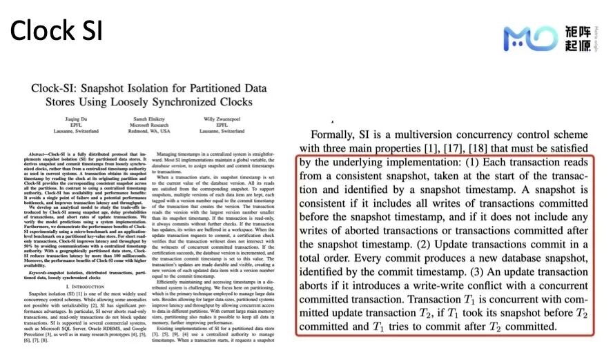 Clock SI本身定义如上图红框圈中内容。任何一个事务会开启一个一致性快照,快照的开始时间是由一个快照时间戳确定的,在这个时间戳以前,所有已经commit的事务在这个快照里都可见。提交的时间戳是全序的。如果发生并发写写冲突,事务会被取消。