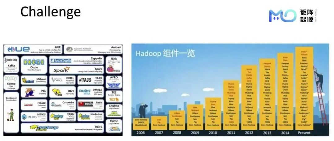 企业在做数字化转型时,常常会构建技术中台,基于Hadoop搭建出一整套数据处理系统。下图展示了Hadoop体系内常见的数据组件,如图所示组件众多,有版本、兼容性等大量细节问题需要处理,学习成本、维护成本和维护难度高。