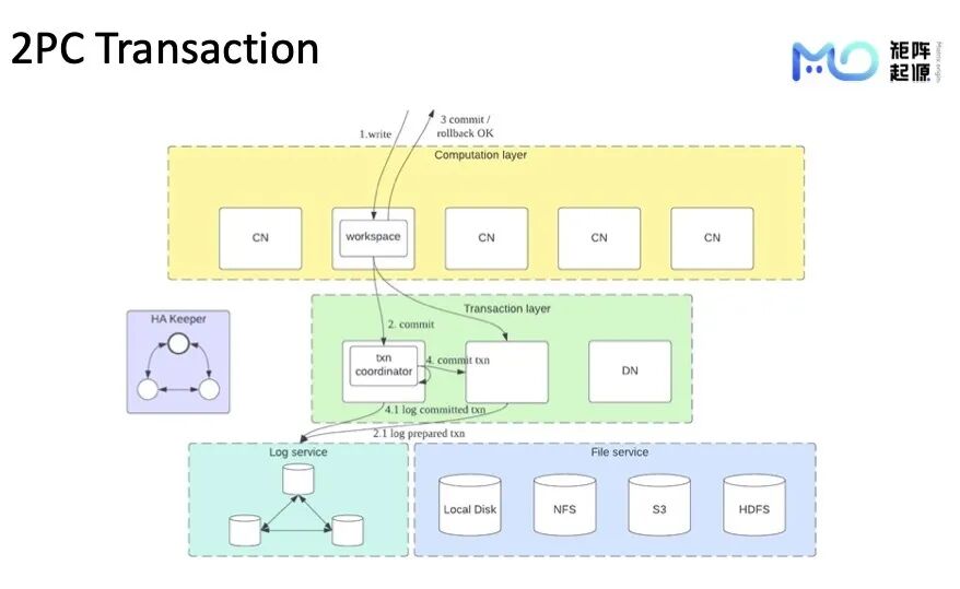 Matrixone使用的两阶段提交(2PC)实现事务和目前NewSQL方案略有区别。具体写入流程如下: