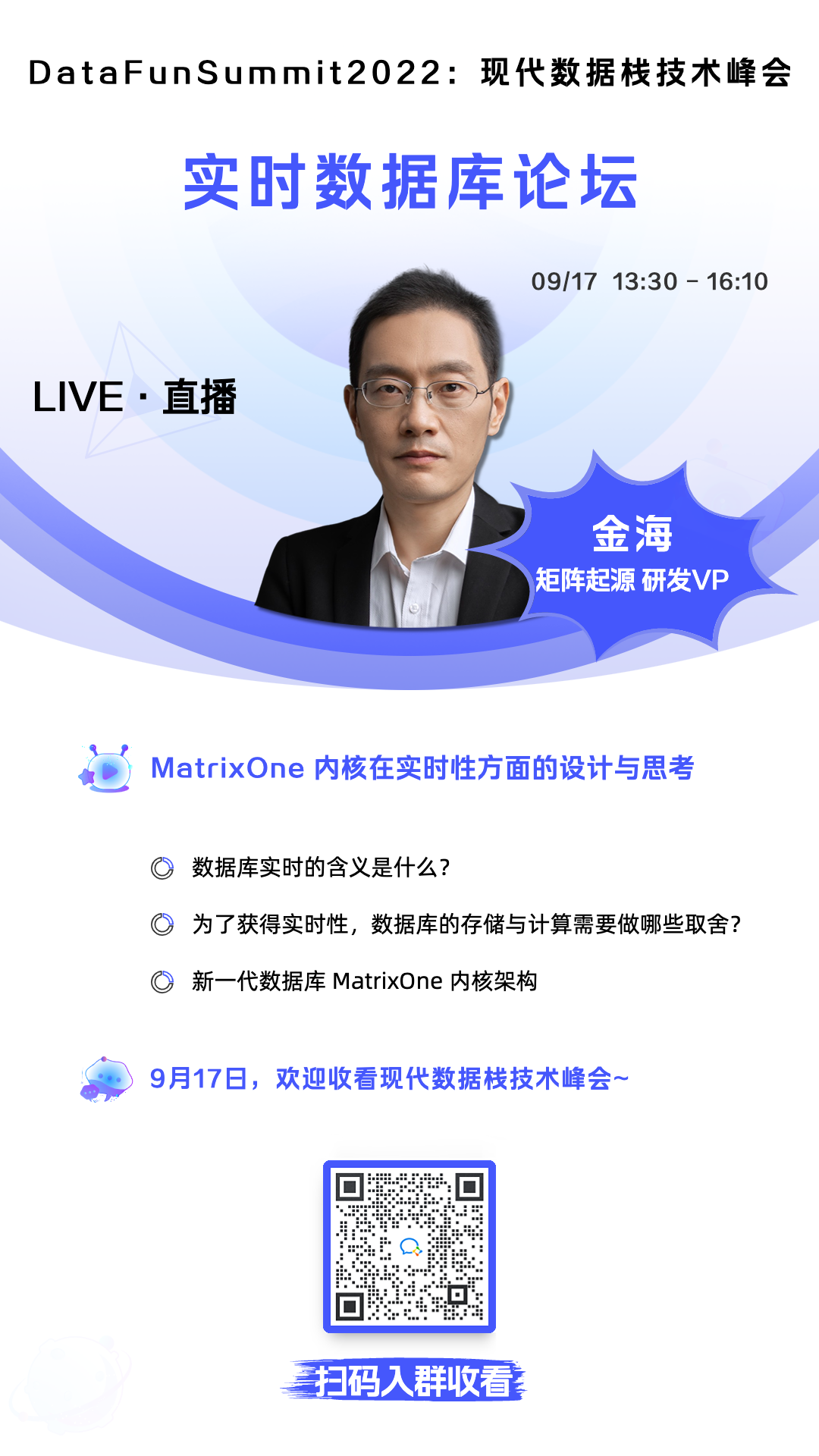 矩阵起源全面拥抱开源生态,以开源开放的方式探索数字化道路。我们拥有多个行业的数字化转型最佳实践。欢迎感兴趣的同学们关注9月17日13:30 - 16:10,由矩阵起源研发VP金海带来的在线分享“MatrixOne内核在实时性方面的设计与思考”~