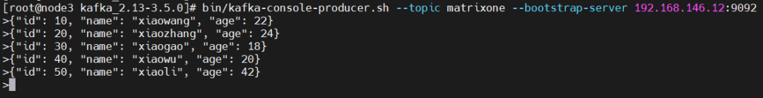 使用 Kafka 提供的命令行生产者工具,您可以向 Kafka 的 "matrixone" 主题中添加数据。在下面的命令中,使用 --topic 参数指定要添加到的主题,而 --bootstrap-server 参数指定了 Kafka 服务的监听地址。