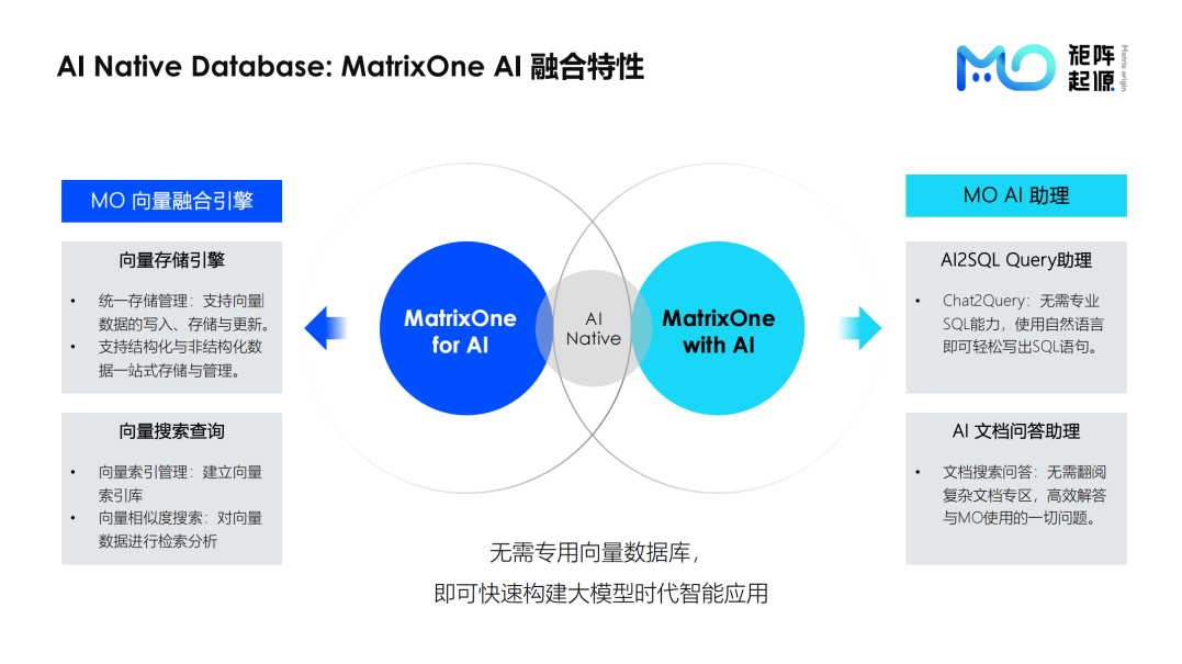 活动开场,矩阵起源创始人 & CEO 王龙为大家分享了AIGC 时代的数据平台发展趋势。在 LLM 大模型赋能下,AI 新时代已经到来。当大语言模型遇到数据库,数据库也必然要做出创新。在 AI 时代背景下, 向量数据库开始出圈、部分现有数据库加入了向量能力、也有些数据库在文档中添加了智能检索功能。而 MatrixOne 从一开始,便是一款面向未来、面向 AI 时代的数据库产品。王龙为我们分享了 AI Native Database:MatrixOne AI 的融合特性,无需专用向量数据库,使用 MatrixOne 即可快速构建大模型时代智能应用。
